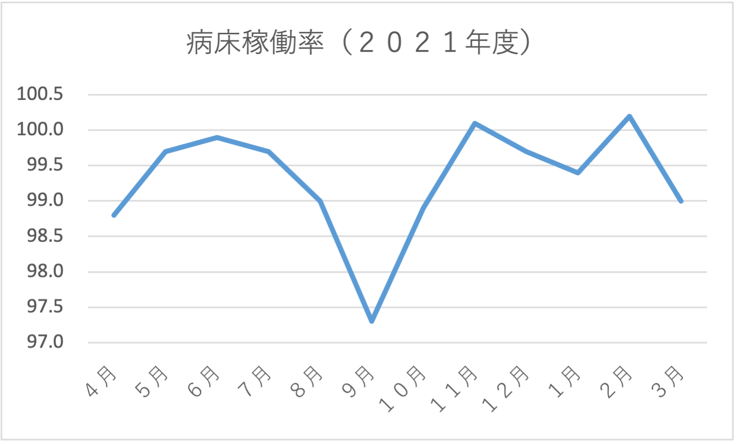 | 病床稼働率 | 98.8 | 99.7 | 99.9 | 99.7 | 99.0 | 97.3 | 98.9 | 100.1 | 99.7 | 99.4 | 100.2 | 99.0 | 99.3 |