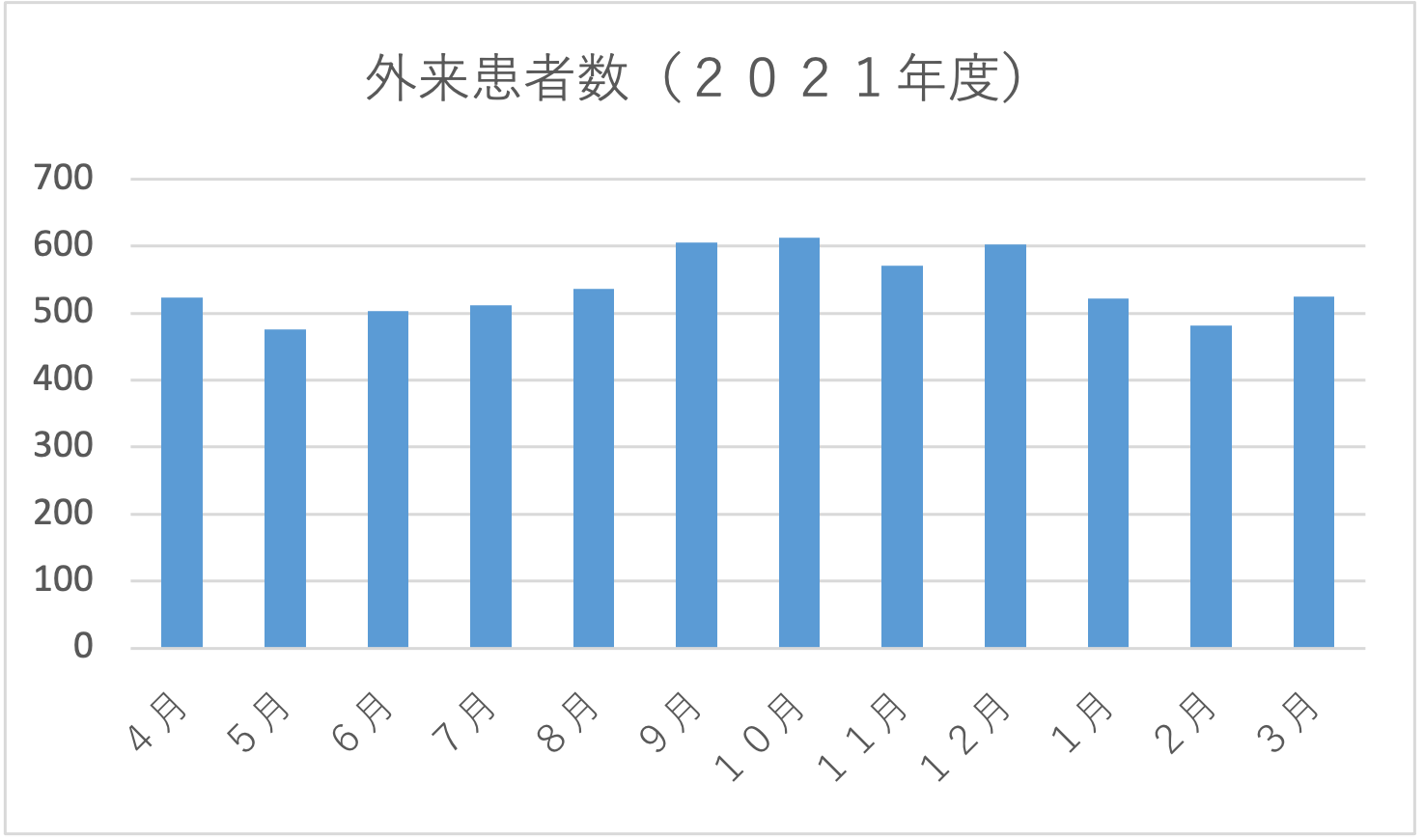 | 外来患者数 | 523 | 476 | 503 | 511 | 536 | 605 | 612 | 570 | 602 | 522 | 482 | 525 | 6467 |