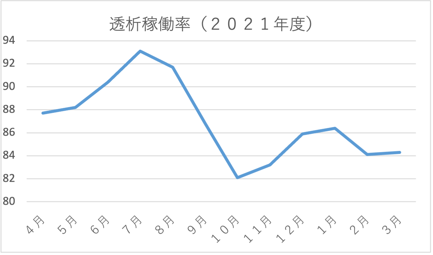| 透析稼働率 | 87.7 | 88.2 | 90.4 | 93.1 | 91.7 | 86.8 | 82.1 | 83.2 | 85.9 | 86.4 | 84.1 | 84.3 | 87 |