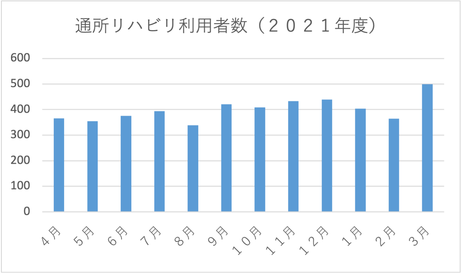 | 通所リハビリ | 366 | 355 | 375 | 394 | 338 | 421 | 408 | 433 | 439 | 403 | 364 | 499 | 4795 |
