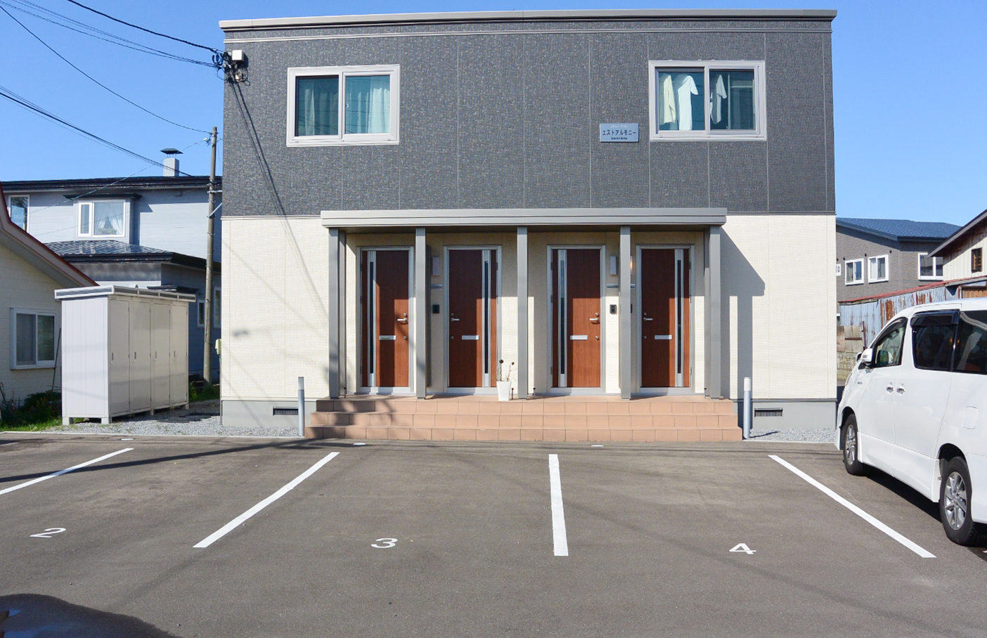 病院徒歩3分、コンビニ1分と恵まれた環境に立つ3階建ての白い建物。