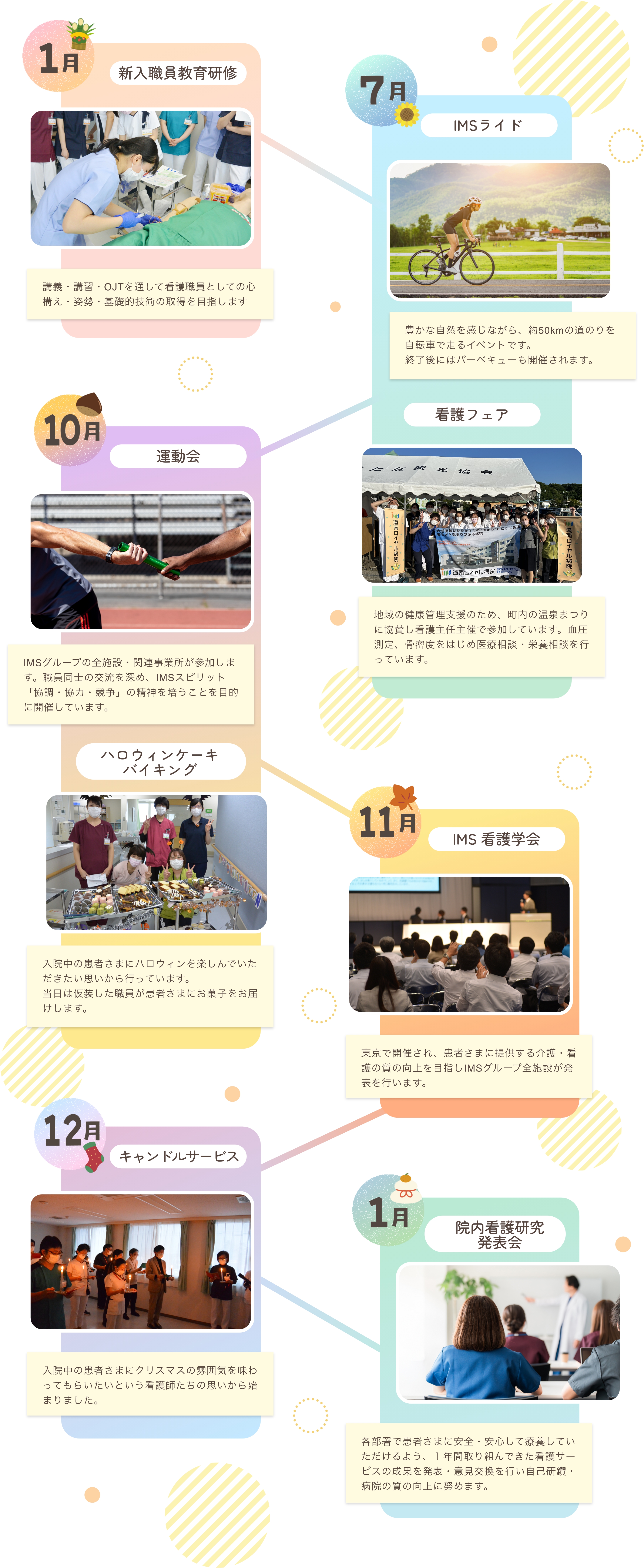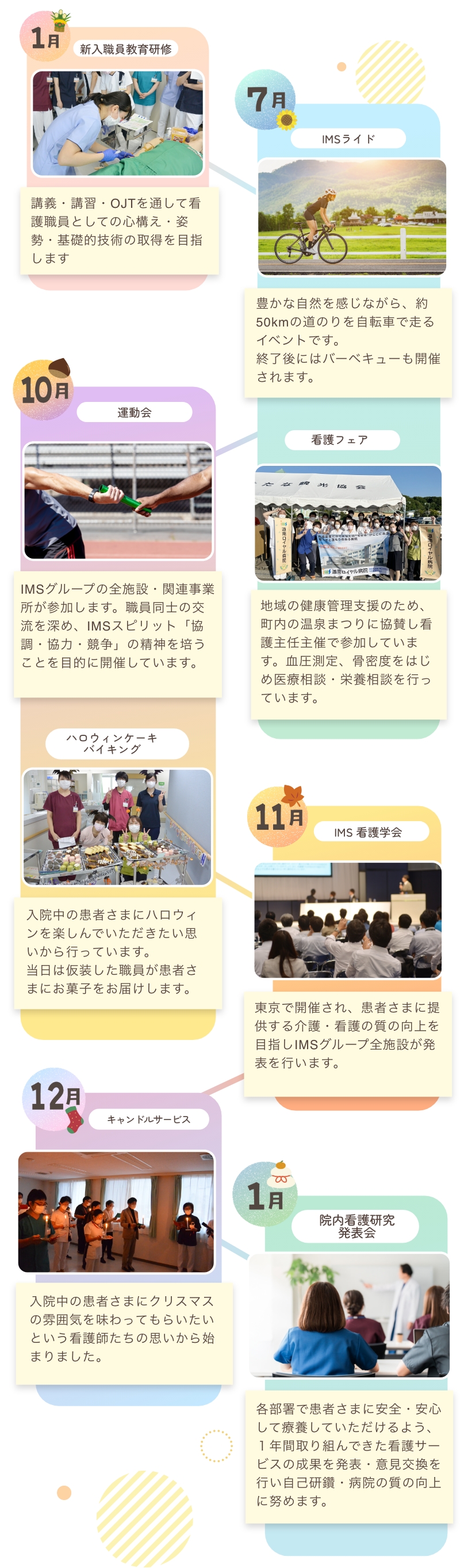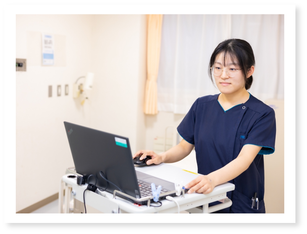 当院は、慢性期病院なのでゆっくりした時間の中、仲間たちとともに働き、相手の心に触れ寄り添う看護を提供できるよう努力を重ねています。