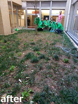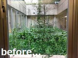 病院スタッフ2名と共に2F外来待合スペースの隣にある中庭の手入れを行いました。