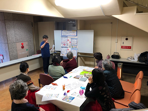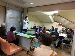 テーマは「認知症予防のための運動習慣」。“座ったまま行う運動”と“立ちながら行う運動”の2パターンを紹介。参加された方々と習慣化できるよう簡単な動作で繰り返し行いました。