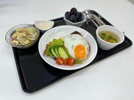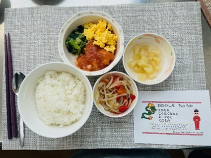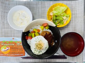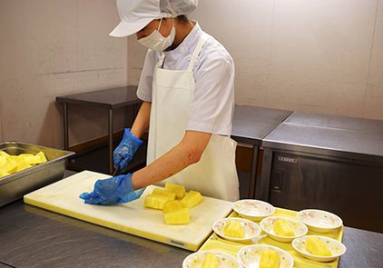 入院患者さまに安全・安心な食事を提供するため、衛生管理の基準に則って調理・ 盛り付けを行います。献立は、栄養バランス、 味付けにこだわり、退院後の食事の参考となるように 心がけています。また、月に1回以上行っている行事食では、 季節の食材を用いたり、伝統的な料理を取り入れたりなど食事を楽しんでいただけるように工夫をしています。産科食も同様にお食事の提供を行う他、おやつやお祝膳の提供を行っています。