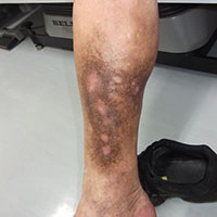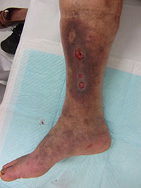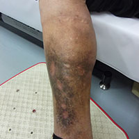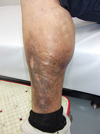 72歳男性の患者さまです。普段は地域の皆さんに愛される八百屋さんで、常に立ち仕事で以前より右内くるぶしの湿疹とかゆみ、色も黒かった(色素沈着)もあったようです。潰瘍にもなり、潰瘍からの出血があり当院へ紹介されました(写真1)。