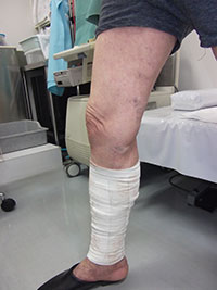 超音波検査を行い、下肢静脈瘤による静脈うっ滞性潰瘍と診断いたしました。圧迫療法(写真2)を開始し、潰瘍は改善いたしました(写真3)。