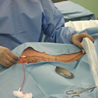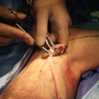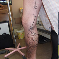 圧迫療法は下肢静脈瘤の根本的な治療ではありませんので、手術療法をおすすめしました。 太もも(大腿部)内側の大伏在静脈の逆流(写真4)が原因なので、大腿部は小さな針穴だけの高周波アブレーションカテーテル治療(写真5)を行い、ふくらはぎの静脈瘤は小切開による静脈瘤切除(写真6)を行いました。
