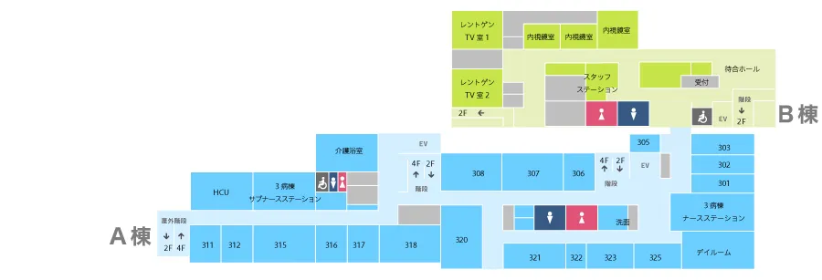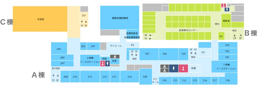 B棟2階(ベッド数23床)で血液透析を行っています。集中管理されたシステムでより安全な透析治療を提供するとともに、新館では全台オンラインHDFで、全室個室(TV完備)のプライバシーに十分に配慮された空間で落ち着いて透析治療が受けられるようになっております。
