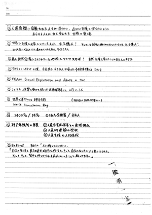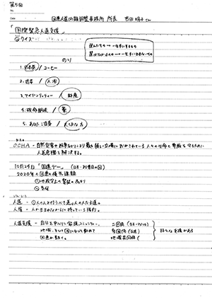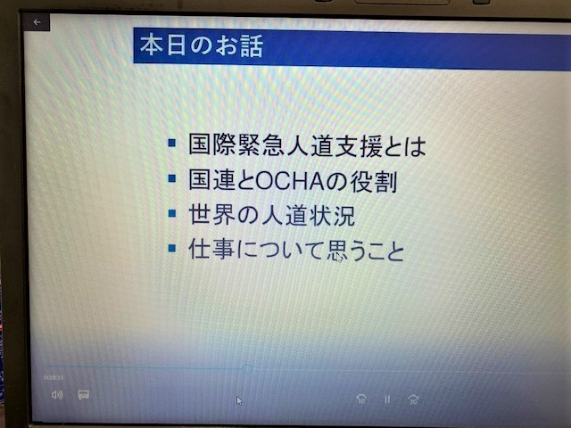 私は今までOCHAも人道支援もまったく知識がありませんでした。世界で苦しんでいる人たちのために実際に現地に行き,支援をするのは危険でとても大変なことだと思います。またその方達の調整を行うOCHAの仕事も知ることができ良かったです。吉田さんは自身の小さい頃の経験もふまえ,現在人のためになる仕事をしていて,そういった幼少期の体験は自分を形成してく上で大切なんだと改めて感じました。