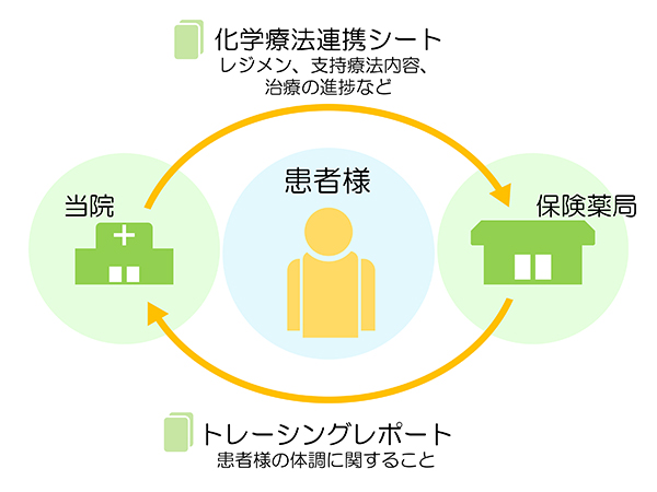 当院で外来化学療法を行っている患者様の治療に関する情報は、レジメン内容・支持療法内容等、随時保険薬局へ情報提供を行っております。病院-保険薬局が連携して患者様の状態を把握することで、副作用の早期発見や医師への処方提案など、より質の高いきめ細やかな薬物治療が提供できるよう取り組んでおります。緊急性はないが処方医師へ情報提供が必要だと判断された内容に関しましては、トレーシングレポートに内容を記載の上、薬剤部宛にFAXにて送付していただきますようお願い致します。緊急性があると判断される場合には患者様から当院へ電話相談していただくようご案内ください。