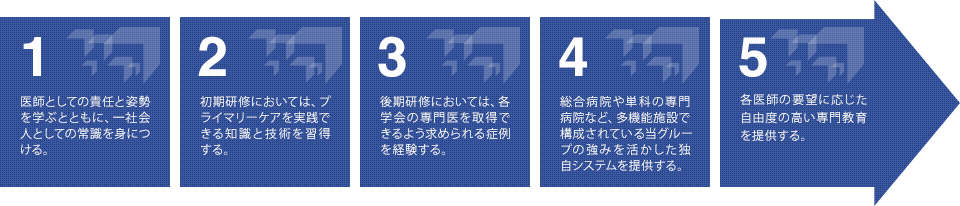 多くの優秀な指導医のもと、医師としてのキャリアの礎となるさまざまな知識、技術、問題解決能力などを身につけます。多彩な施設のネットワークなど、グループならではのメリットを存分に活かしたプログラムをご用意しています。