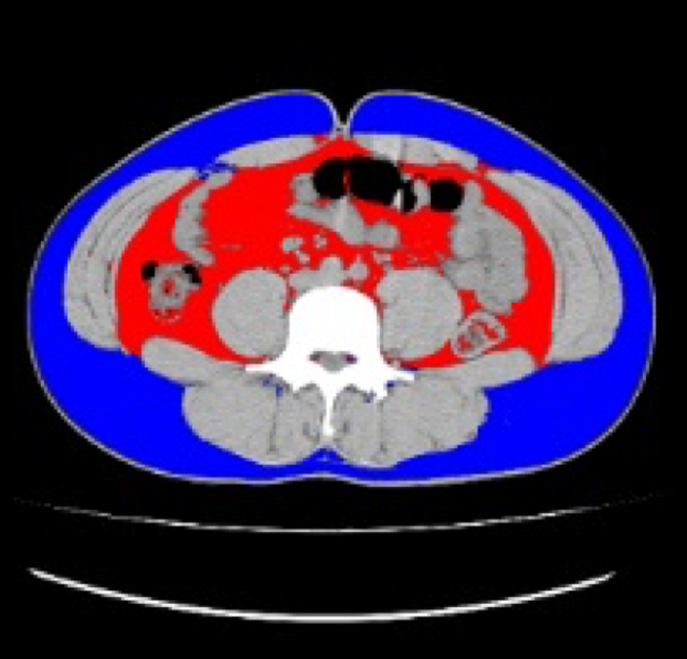 内臓脂肪型肥満の方の画像になります。青の皮下脂肪に比べて赤の内臓脂肪面積の方が広いことがわかります。