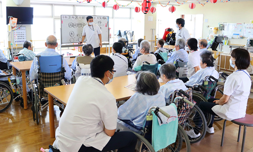 自宅退院患者様へは退院前の練習としての外出支援や試験外泊の実施しています。またリハビリ以外の時間についても重要と考えており、集団での体操やレクリエーション、季節の行事を積極的に実施しています。