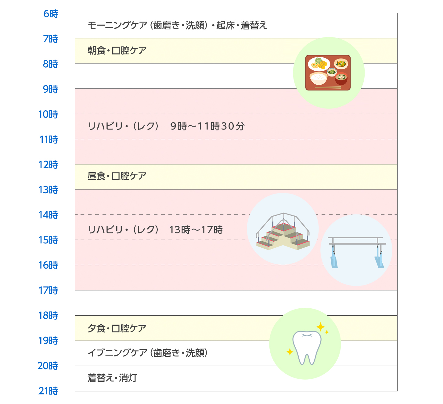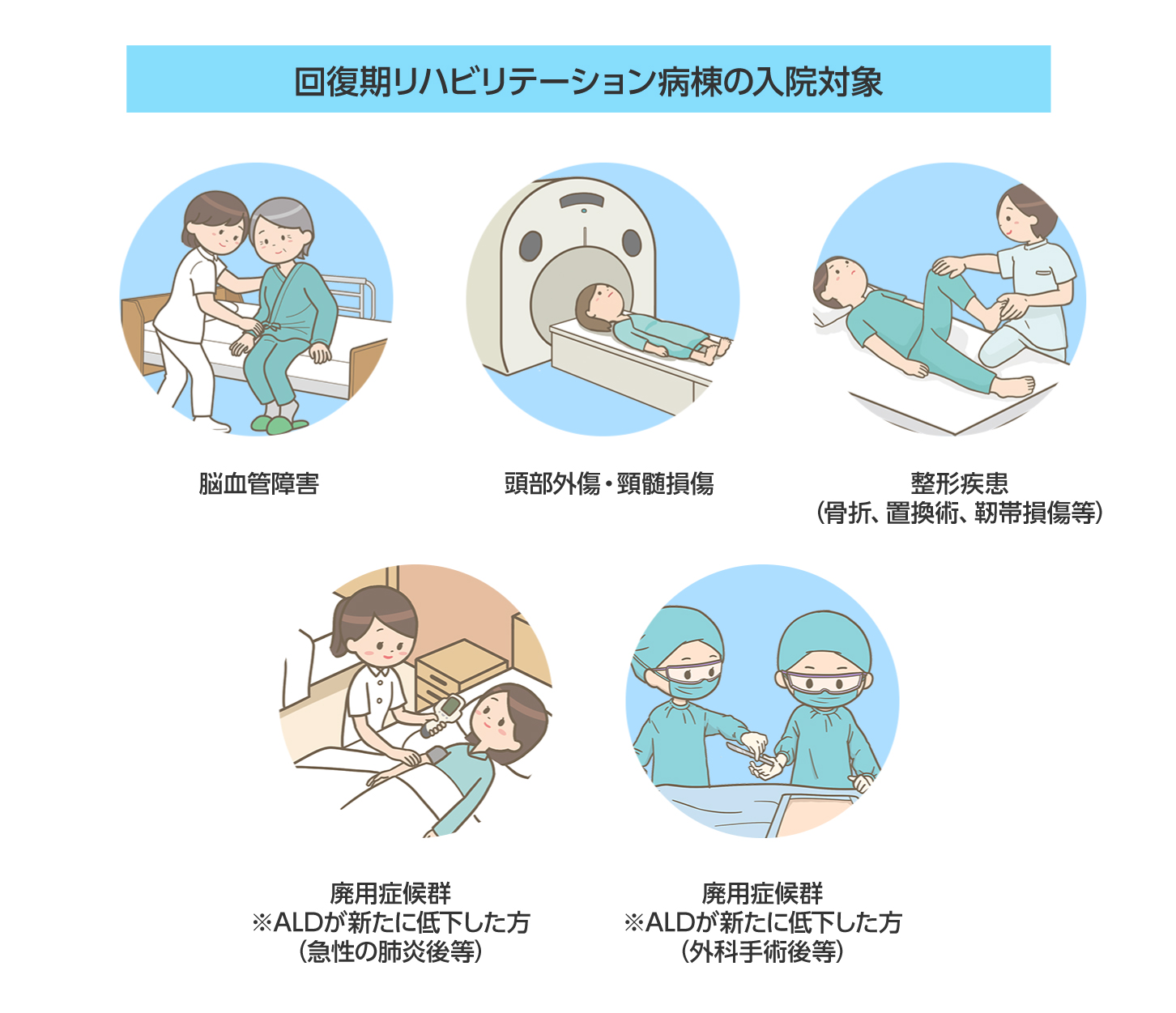脳血管疾患や大腿骨骨折・外科手術後の廃用症候群など、急性期の治療を終えられた患者さまの寝たきり予防・日常生活動作の改善・在宅復帰を目的としたリハビリテーションを集中的に行う病棟です。回復期リハビリテーション病棟協会の報告では、質の高い十分なリハビリテーション訓練時間の担保が、日常生活動作の改善の予後や、在院日数、在宅復帰に影響を与えるとされています。当院では365日体制で患者様一人につき2~3時間の個別リハビリを集中的に行うことで、高いリハビリ成果を上げております。入院時から自宅退院に向けプログラムを立て、医師・看護師・理学療法士・作業療法士・言語聴覚士・医療ソーシャルワーカー、薬剤師、管理栄養士、介護福祉士などがチームを組んで、患者さま・ご家族さまと話し合いながら、退院に向け支援を行って参ります。