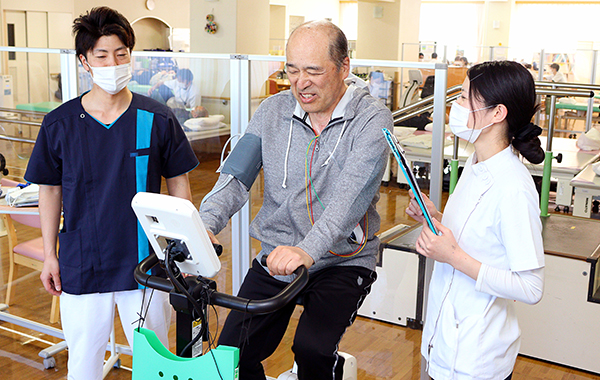心臓リハビリテーションとは、心筋梗塞や心不全などの患者さんに対して、快適な家庭生活や社会生活に復帰するとともに、再発や再入院を防止することを目指して行う包括的プログラムです。内容として、運動療法を中心に食事指導・服薬指導・生活指導などを実施します。その為、多職種連携が重要となります。当院では運動実施場面に理学療法士だけでなく看護師・管理栄養士も参加し生活上での注意点や疑問点などを適時指導・助言させていただく体制を整えております。