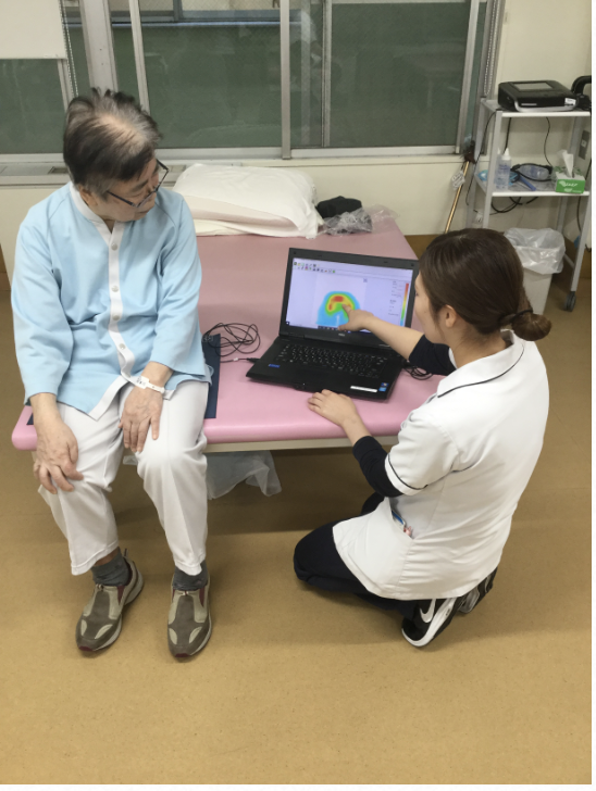 座圧測定器(圧力分布測定ツール SRソフトビジョン)を導入しました。車椅子上でのポジショニングや適切なクッションの選定時にはもちろん、ベッド上臥位での体圧を測定し、褥瘡などがある部分にポジショニングを施した後、適切に除圧ができているかを確認するのに使用しています。