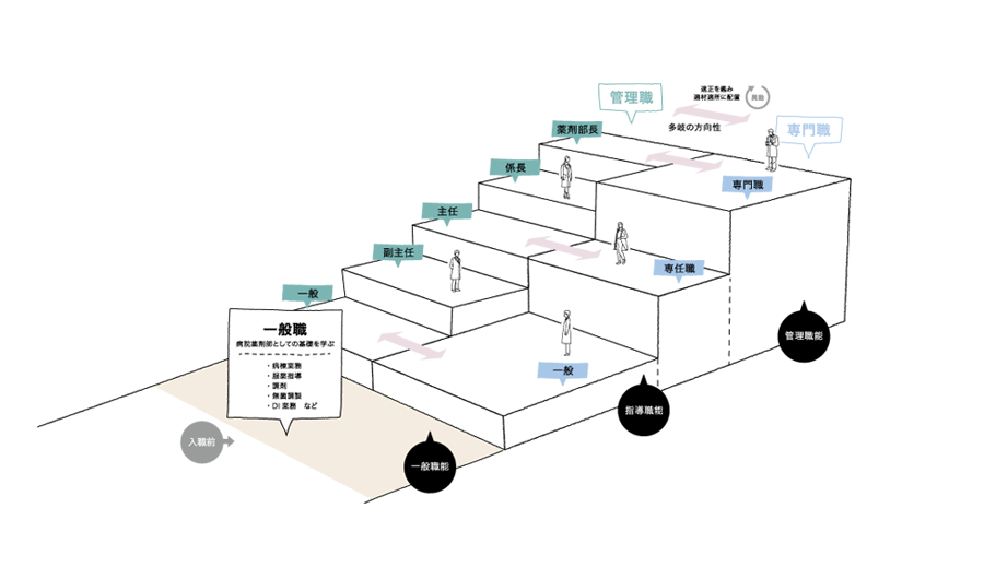 年次別薬剤師研修、中間管理職研修など段階を経て知識・技能を⾼め、最終的に労務、⼈事、経営など管理者に必要な知識を⾝につけていきます。