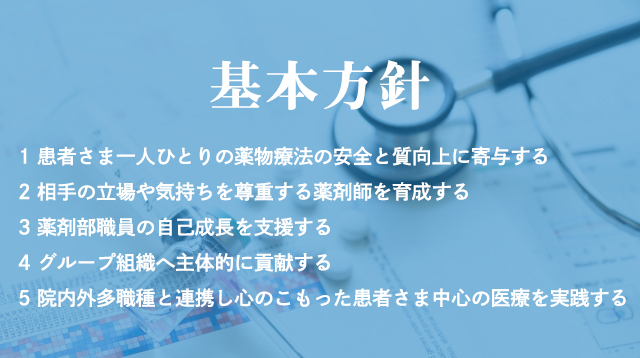 私たちは、患者さまや地域住民の皆さまのために向上心をもち、医療人としても薬剤師としても組織人としても成長していきます。