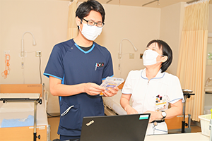 薬剤部内の心不全ワーキンググループに参加。心不全の患者用資材を作成し、患者さまのアドヒアランスの向上に努めています。病棟業務では心不全予備軍の患者さまに対し、今後心不全にならないような療養指導を行っています。