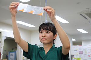 ICUで病棟業務に従事し薬剤管理指導を含めた薬学的介入を行っています。持参薬鑑別、点滴ルートや配合変化の確認、急変時対応、薬物治療モニタリング、薬物治療の提案など業務は多岐に渡ります。